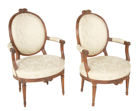 Pair of Louis XVI period oval back walnut fauteuil with stop fluted legs, bow knot and ribbon crest rail and apron. Circa 1780's.