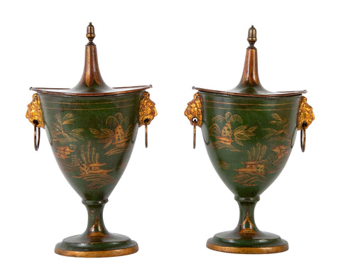 Pair of English Regency painted & gilt iron/tole Chestnut urns. Circa 1810 - 1820.