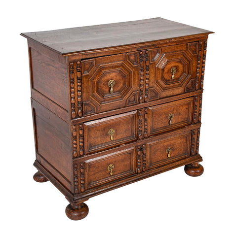 Late 17th/Early 18th century William and Mary oak chest with carved geometric design.