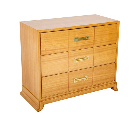Tommi Parzinger for Charak Modern bleached mahogany chest of drawers with brass hardware. Circa 1945.