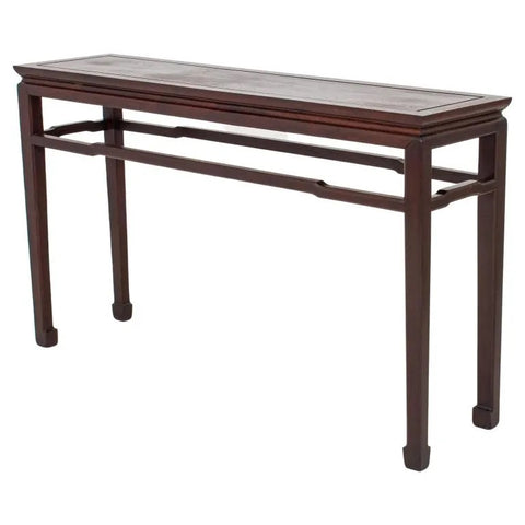 Fine 20th Century Asian mahogany console raised on carved tapered legs joined by stretchers. Quality craftsmanship and fine proportions.
