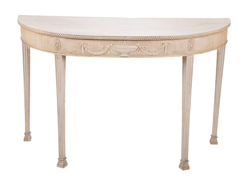 A George III bleached mahogany demi-lune console table. The D-form top has a spiral-twisted, molded edge and square tapered legs ending in block feet.