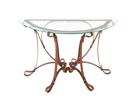 A glass top console table having a faux leather finished iron base.