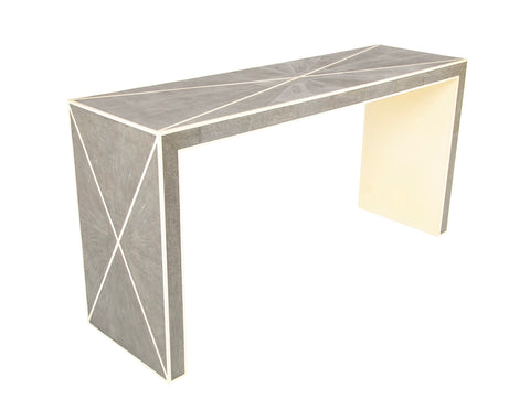 A stunning rectangular console table with triangles panels of shagreen veneer delineated by raised cream colored lacquer borders. This beautiful Karl Springer style console with make and entryway or foyer, or any other room it is placed in. Expertly cleaned and refreshed, ready to be placed. Hand crafted in the Philippines for Maitland Smith.