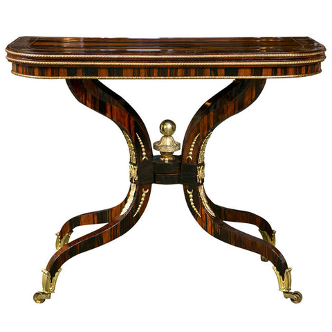 An English Regency rosewood and calamander brass inlaid ormolu mounted games table with patented "lazy tongs" action in the manner of William Wilkinson and George Oakley and bearing Russian double eagle mounts. Some ormolu mounts probably not original.