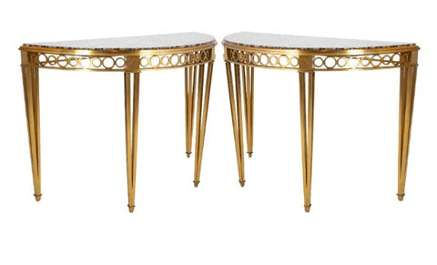 Striking pair of bronze demilune console tables with fossilized marble tops with open work aprons and legs. 20th Century.