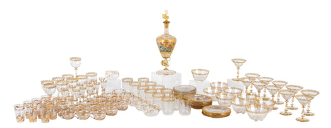 Consisting of : 12 Tumblers : 4" h x 3.18" diameter / 1 Carafe : 17" h x 6" diameter / 11 Champagne glasses : 5.38" h x 4.25" diameter / 12 Juice glasses : 3.63" h x 2.25" diameter / 9 White Wine glasses : 5.63" h x 3" diameter / 12 Punch glasses with handles : 2.25" h x 2.75" diameter / 11 Liquer glasses : 5" h x 2" diameter / 6 Sherbert bowls : 2.38" h x 3.63" diameter / 7 Saucers : 6.5" diameter / 8 Saucers : 7" diameter / 9 Finger bowls : 2.75" h x 5" diameter