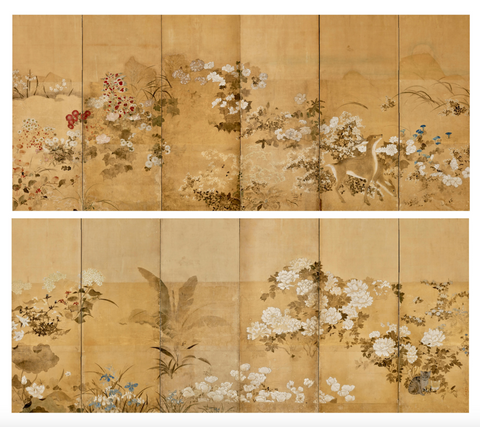 A pair of six panel screens depicting seasonal flowers, one with a deer and one with a cat. Each bearing the Inen seal associated with followers of Tawaraya Sotatsu (1570-1643)