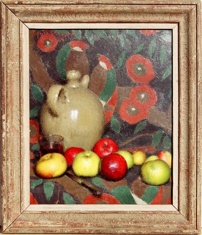 Alfred THESONNIER "Still Life with Apples and a Crock" Signed and dated Alfred Thesonnier 26 Remnants of exhibition tags and stamps on the back of the stretcher Oil on canvas – Excellent condition Original, hand-carved, patinated, Montparnasse-style, wooden frame Thesonnier lost his parents at a young age and was raised in a public orphanage. That early misfortune did not alter his motivation to make a better life for himself and his drive to pursue his passion for painting. The artist received his formal training at "l'Ecole des Beaux-arts" in Dijon. Shortly after, he was admitted to compete in Paris at the highly-regarded "Salon des Artistes Français" where he was awarded a Bronze-Medal in 1927 and a Silver-Medal in 1935. He also exhibited at the avant-garde "Salon des Indépendants" in Paris. Thesonnier had a wide range of subject matters from landscapes to still-life, nudes and portraits. He settled in Auvergne, a mountainous and rural region in the center of France whose gorgeous snow-covered landscapes attracted many leading artists becoming part of the "Ecole de Murol" named after a picturesque village of the area. The artist was also a professor at "l'Ecole des Beaux-Arts" in Clermont-Ferrand, the capital of Auvergne. • Museums: The artist' works can be seen at the Murol museum. • Literature: - Benezit: Dictionnaire des Peintres, 1999