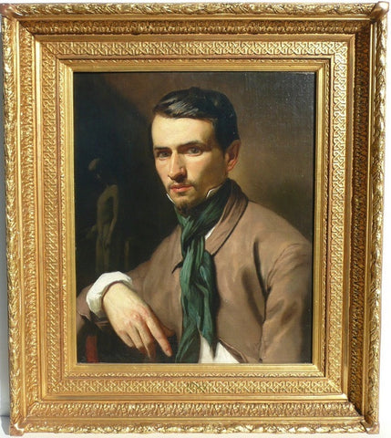 French School late 19th century "Portrait of a Sculptor" Oil on canvas laid on mahogany panel – Good condition, some state of the art retouching on the background. Beautiful, gold-leafed, neoclassical style, 19th C French frame