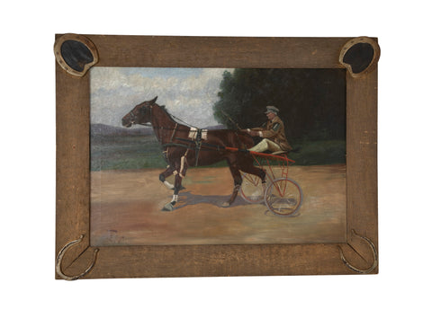 Oil on canvas painting by American artist, Wilbur Leighton Duntley, (1872- death date unknown), signed lower left ” Duntley ’05” (1905) of a horse pulling a sulky with a nattily dressed driver in a wonderful rough wood frame with 2 sets of real horseshoes mounted in the corners. Duntley, born in Michigan, lived in New Hampshire from the 1880s until his death. He was known for his agricultural and fairground paintings and horse portraits. In 1890, he purchased the Rochester, New Hampshire newspaper, The Leader. Circa 1905.