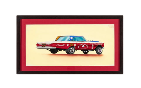 Original signed ink & wash on paper of a red Plymouth race car by American automobile artist/illustrator Russell J. Von Sauers. Sauers worked for Open Air Coupe, GMC Auto, Chrysler Auto, Auto Trend Magazine and Hemmings Auto News. Circa 1970 - 1980.