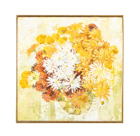 R. Langseth Christensen ( American. 1920 - 2000 ) oil on canvas of a vase of yellow and white flowers. Circa 1960's.
