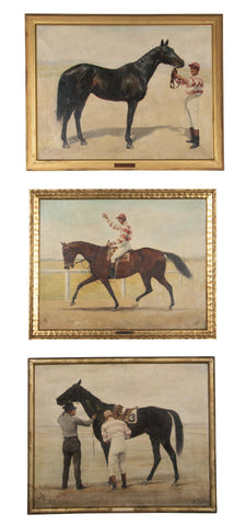 Set of three oil on canvas paintings of steeplechase horses and jockeys by George Lee. Circa 1897-1905. Sold only as a set of three.