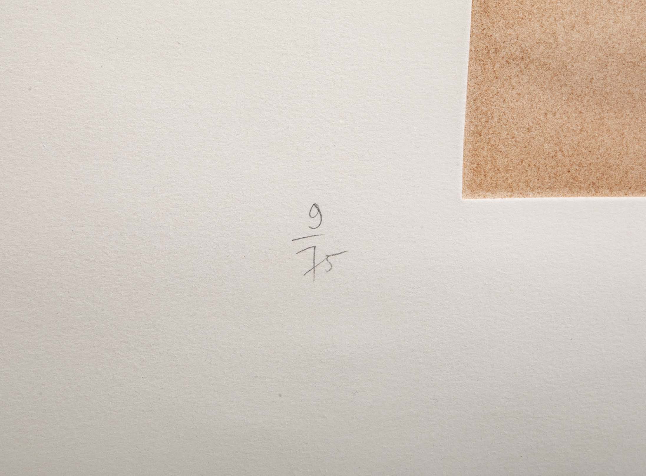 Etching, aquatint & relief print of cascading basic beige shapes by Belgian artist Pol Bury, one of the founders of kinetic art. Signed and numbered 9/75. France. Turn of the 21st Century.