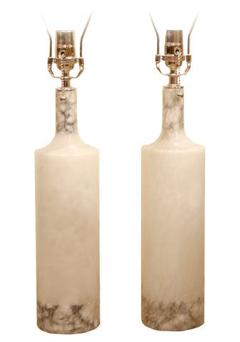 Pair of elegant Italian assemblage alabaster and marble lamps, the bottle-form body with new chrome fixtures and pull-chain sockets. Circa 1950's.