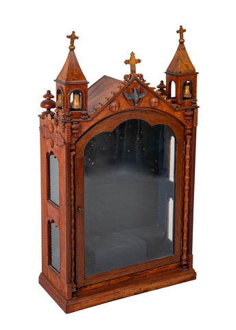 19th century Spanish Colonial shrine for a Santos or statue of the Virgin Mary in the form of a church. Mexican, or possibly from New Mexico. Topped with three crosses, two cupolas housing two gilt wood bells each, a silver gilt dove in center representing the Holy Spirit. The sides with two arched windows each, the interior with a plinth for a carved Santos or Madonna, painted black with stars in the background. Lovely carved details throughout including turned finials on the roof. Clearly created with reverence and care by a master carver, this will make a great home for that treasured carving, a personal shrine, or a wonderful architectural conversation piece. Great scale at almost 4 feet tall.