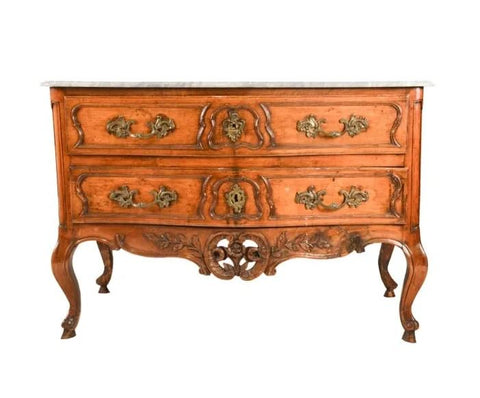 Fine Louis XV Period Provencale commode with gray marble top, serpentine front and finely carved walnut decor, retaining its original bronze drawer pulls. From a private residence near Aix-en-Provence.