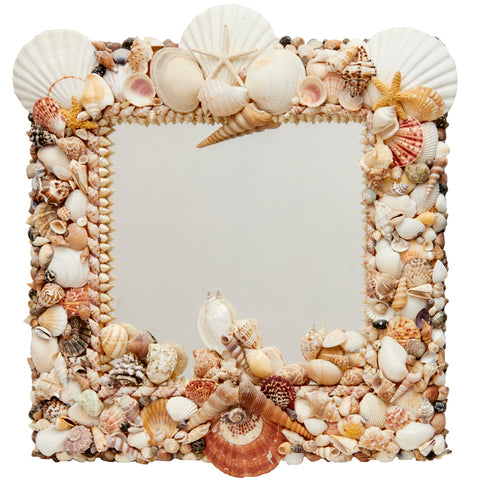 Natural seashell encrusted framed mirror of handmade attractively assorted composition. 20th century. Palm Beach chic !