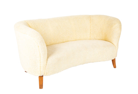 A Danish two seat slightly curved sofa with faux sheepskin upholstery and beech legs. Circa 1930's - 1940's.