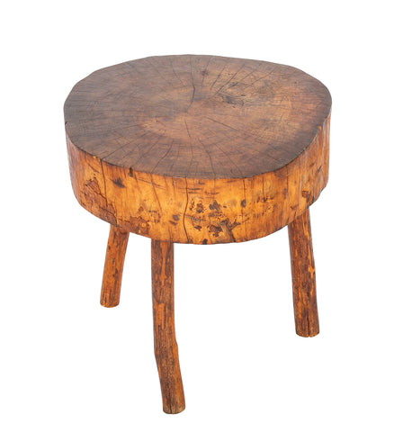 A rustic tripod form side table with thick live edged tree cross section as top.