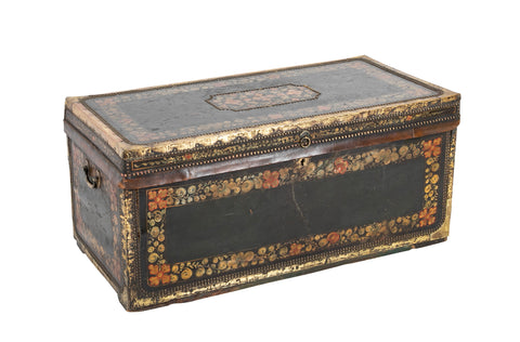 19th century Chinese export leather covered trunk in camphorwood with flower painting.