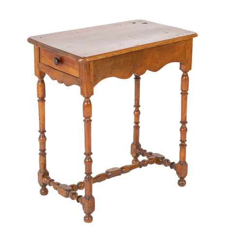 Early 18th century Louis XIII walnut side table with single drawer, turned legs and "H" stretcher.