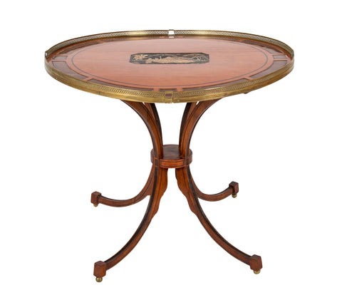 English Neoclassical oval mahogany table with center inlaid Chinese decorative scene and brass gallery.