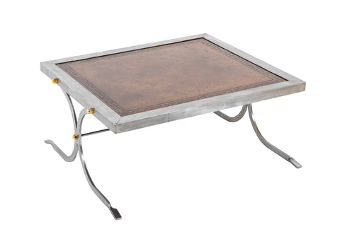 French Maison Jansen Style Polished Steel, Brass and Leather Coffee Table