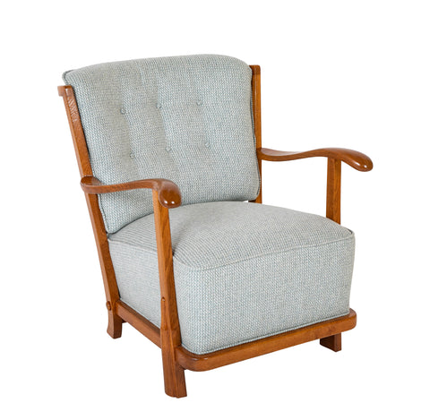 A Fritz Hansen armchair with deep upholstered seat and button fitted upholstered back having an oak frame. Circa 1930's. Denmark.