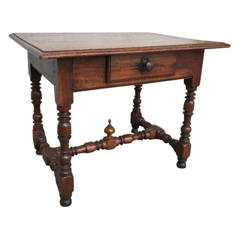 A handsome single drawer side table with beautifully carved and turned walnut base and a chestnut top. Late 17th or early 18th century Italian with a rich and deep honey patina.