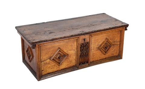Late 16th / Early 17th Century French walnut cassone with Gothic tracery. Circa 1600.