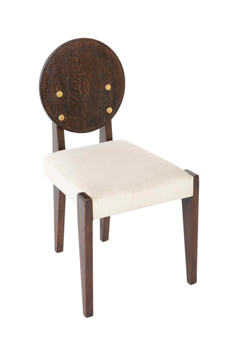 A modern chair in stained Oregon pine with leather seat and brass cabochons. Having Brass nail borders around oval back (indicative of Andre Sornay)