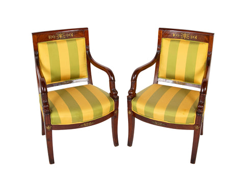 Pair 19th Century French Mahogany Empire Upholstered Armchairs With Bronze Mounts