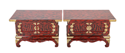 Great looking pair of late Meiji Period Japanese black and red lacquers side tables with etched brass mounts. Each with two doors that open for storage, this stunning pair with really stand out in any decor. Just back from my restorer, refreshed, polished and ready to go. Circa 1900.