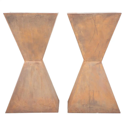 Compelling pair of geometric steel side tables or pedestals very much in the style of Constantin Brancusi. With a soft rust colored patina, these will make great lamp stands or wonderful pedestals for sculpture or other objects.  Circa 1970's.
