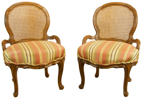 Pair of slipper chairs with cane back and striped upholstered seat.