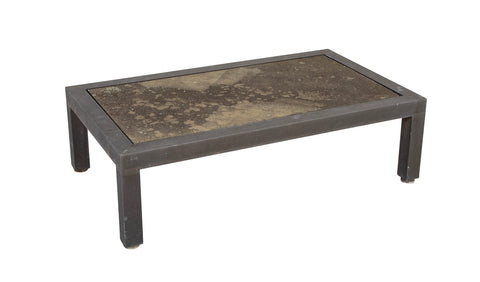 A patinated aluminum and slate top outdoor coffee table by Joseph Grusczak.
