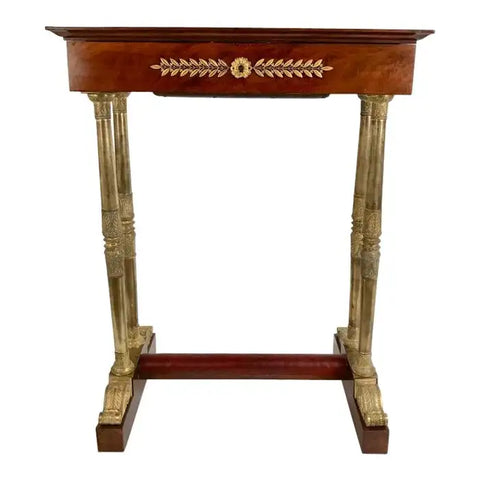 A very fine Continental Regency period mahogany lift-top dressing table with high quality bronze d'ore legs and mounts. The columns with capitals decorated with palm leaves and papyrus flowers showing the Egyptian influence that became popular in the Regency and Empire periods after Napoleon's expeditions to Egypt in the early 19th century. Made originally as a vanity, this table will make a singular side table, a stunning addition to any room, antique or modern. Circa 1815.
