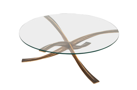 A round coffee table by Michel Mangematin (b1928) having a graceful tripod base in bronze. France.