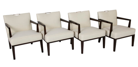 Set of four Edward Wormley for Dunbar armchairs newly upholstered in Rogers & Goffigon fabric. Circa 1950's.
