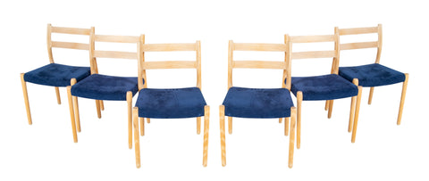 Set of Six Niels Moller beech dining chairs manufactured by Mollers Mobelfabrik, Denmark. Seats now upholstered in blue Alcantara fabric. Mid 20th century.