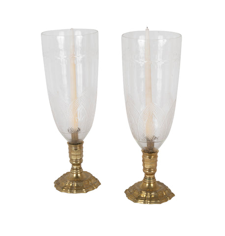A Pair of French Bronze Photophores with Engraved Hurricane Shades