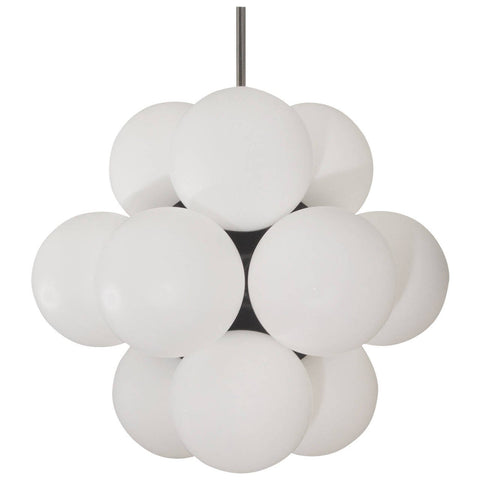 Gorgeous Kaiser chandelier with a molecular structure, much more dense visually than comparable Sputnik form chandeliers. Gloss black enamel central body is surround by 12 closely attached opal globes.