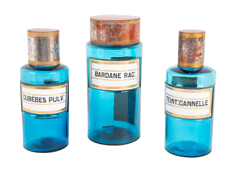 Set of three 19th century French cobalt blue glass pharmaceutical bottles. Circa 1890's.