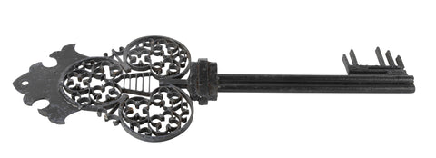 French wrought iron black painted locksmith trade sign in the form of a large and elaborate key. The trefoil top filled with interlocking Gothic style quatrefoils (like four leaf clovers), with a ladder in the center joining them and a cut metal crest above. Circa 1900.