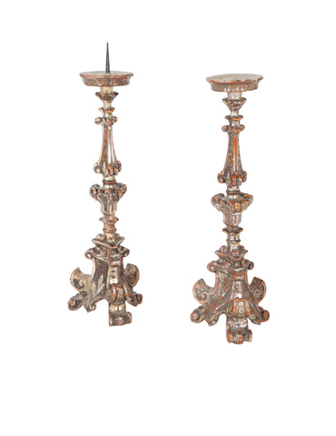 Pair of hand carved Italian altar sticks in silver gilt finish.