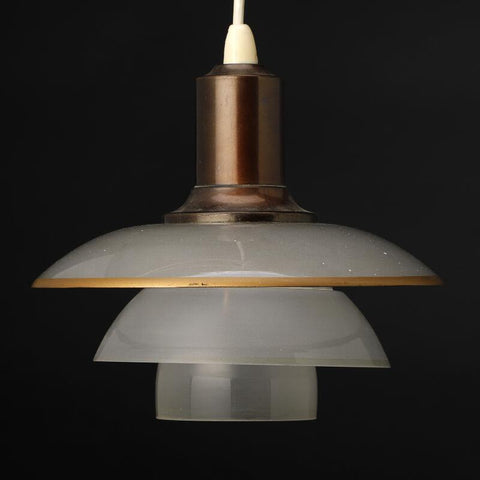 “PH-2/2”. Pendant with browned brass socket house marked “Patented” and “PH-2”. Frosted glass shades. Top shade with painted golden rim. Manufactured by Louis Poulsen.