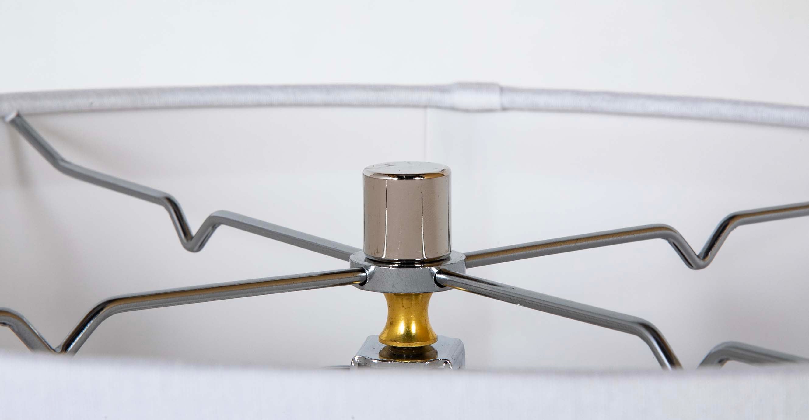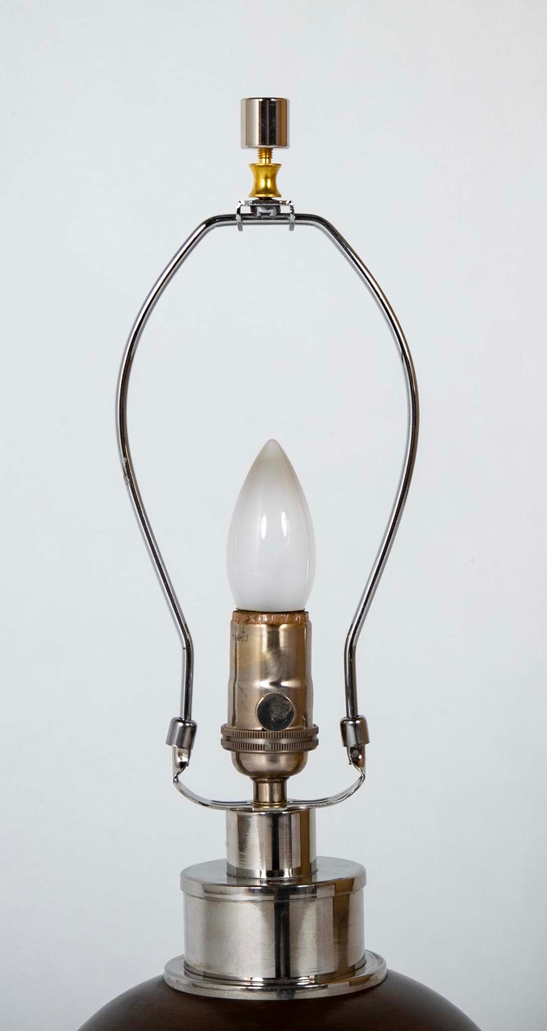 A French turned wood sphere on stepped round chromed metal base now a lamp. Circa 1970's.