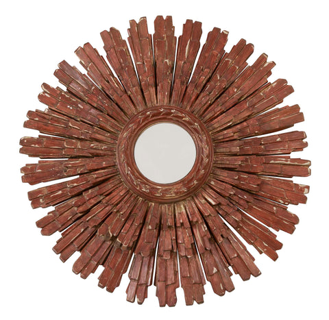 Italian hand carved wood starburst mirror in red bol. Originally gilded, now worn down to the red base, 'bol', that the gilding is set on, it makes for a unique color and surface. The multilayered hand carving gives this piece a lot of depth and presence. Great look.